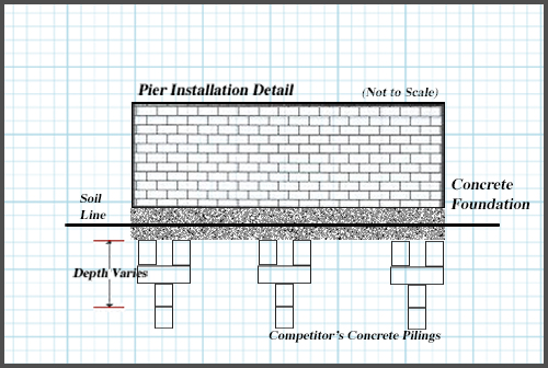 OUR DUAL PIER SYSTEM is the best choice for a lasting repair. Many homes are built using single pier systems where the weight is shared on single fork style piers underneath the home. Over time the pier weakens and if one pier breaks than the entire system will fail and cause what is known as a sinking home foundation.